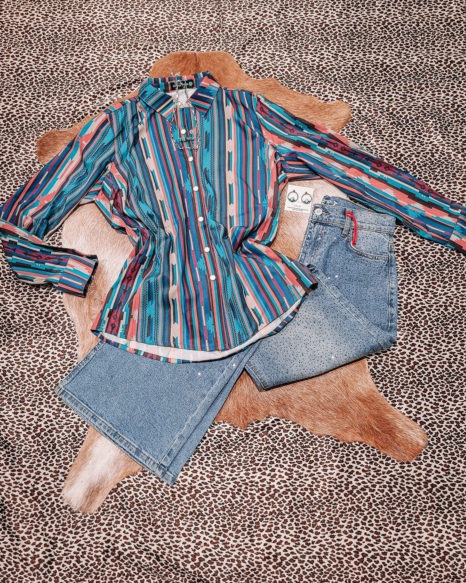 This pearl snap is a great piece with 90's like vibes! Good stretch and room, I personally sized down to small