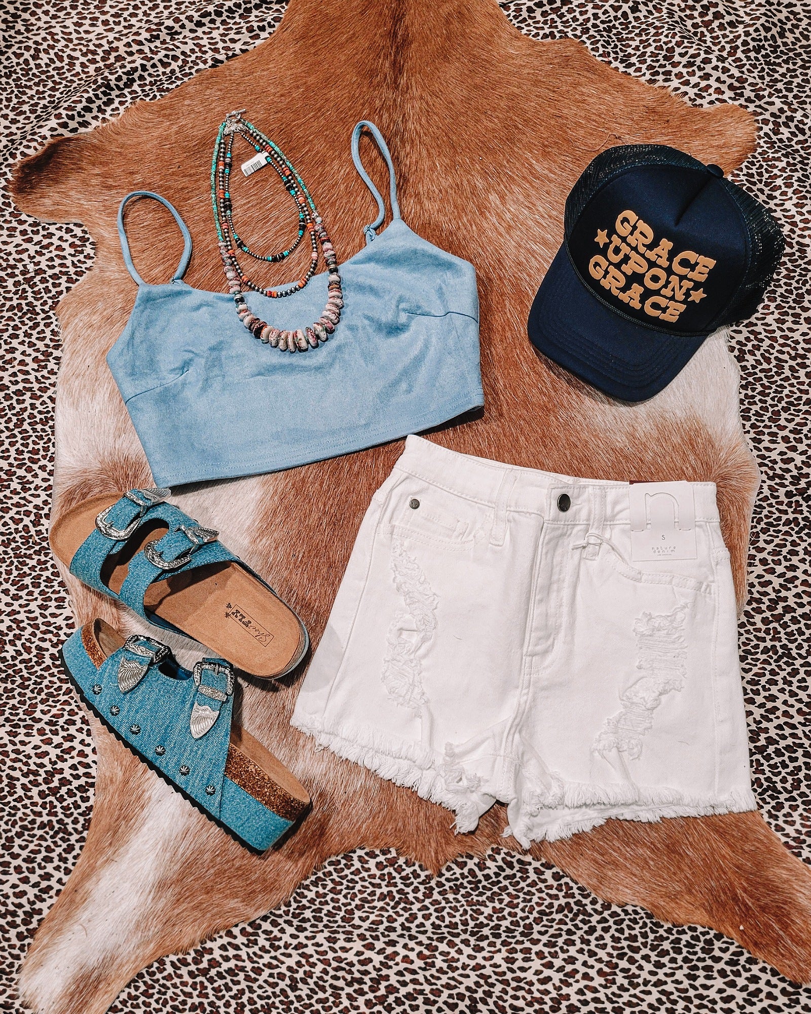 Get ready to turn heads with our Blue Bellini Crop Tank! This crop tank is not only stylish but also has a luxurious suede-like feel. Perfect for any occasion, this tank pairs effortlessly with high-waisted bottoms for a chic and playful look. (Cheers to that!)