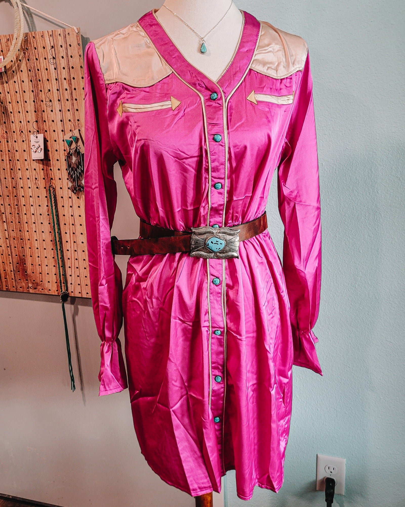 You'll not want to miss out on this unique dress! Turquoise pearl snaps, vintage like details, and so much more!