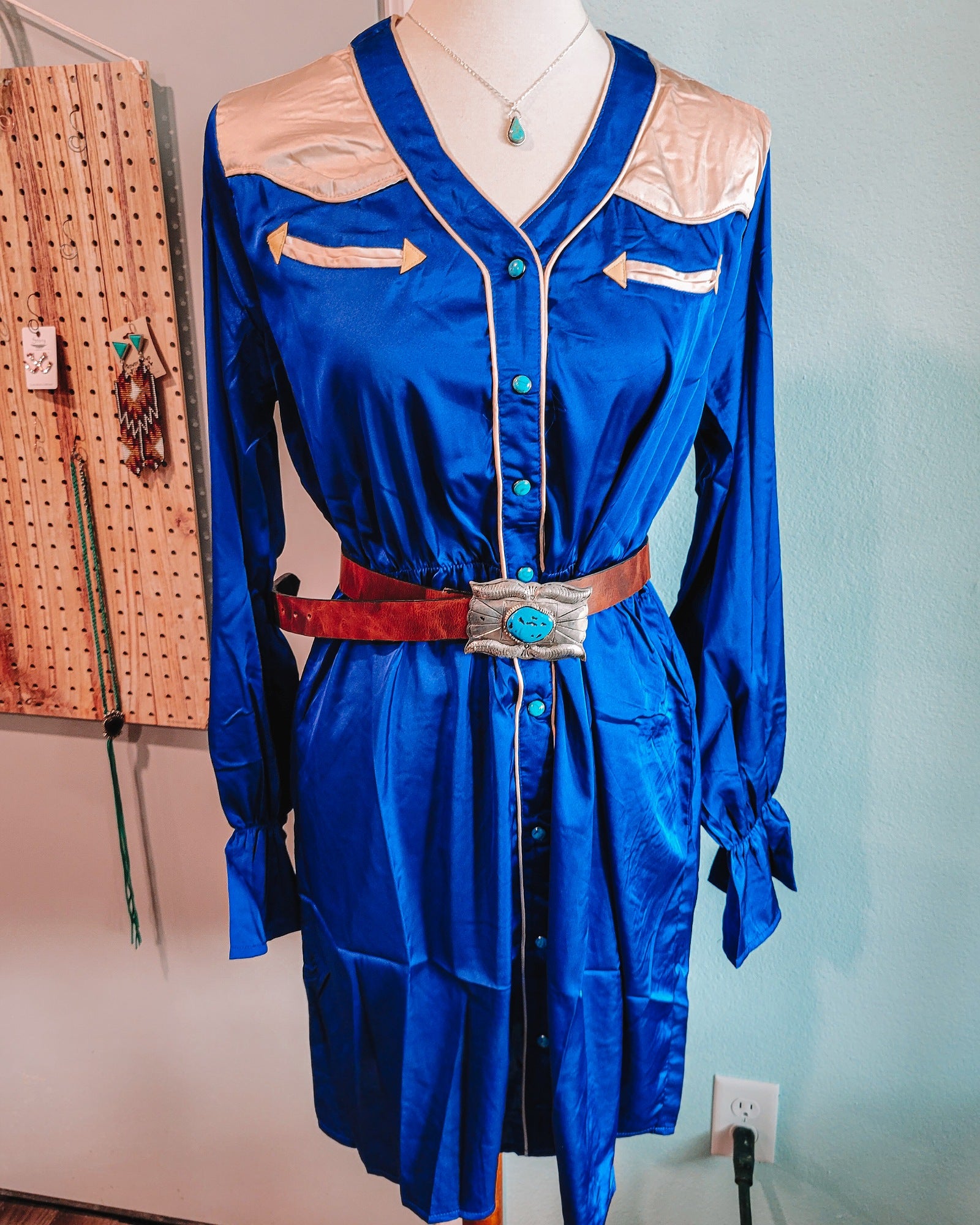 You'll not want to miss out on this unique dress! Turquoise pearl snaps, vintage like details, and so much more!