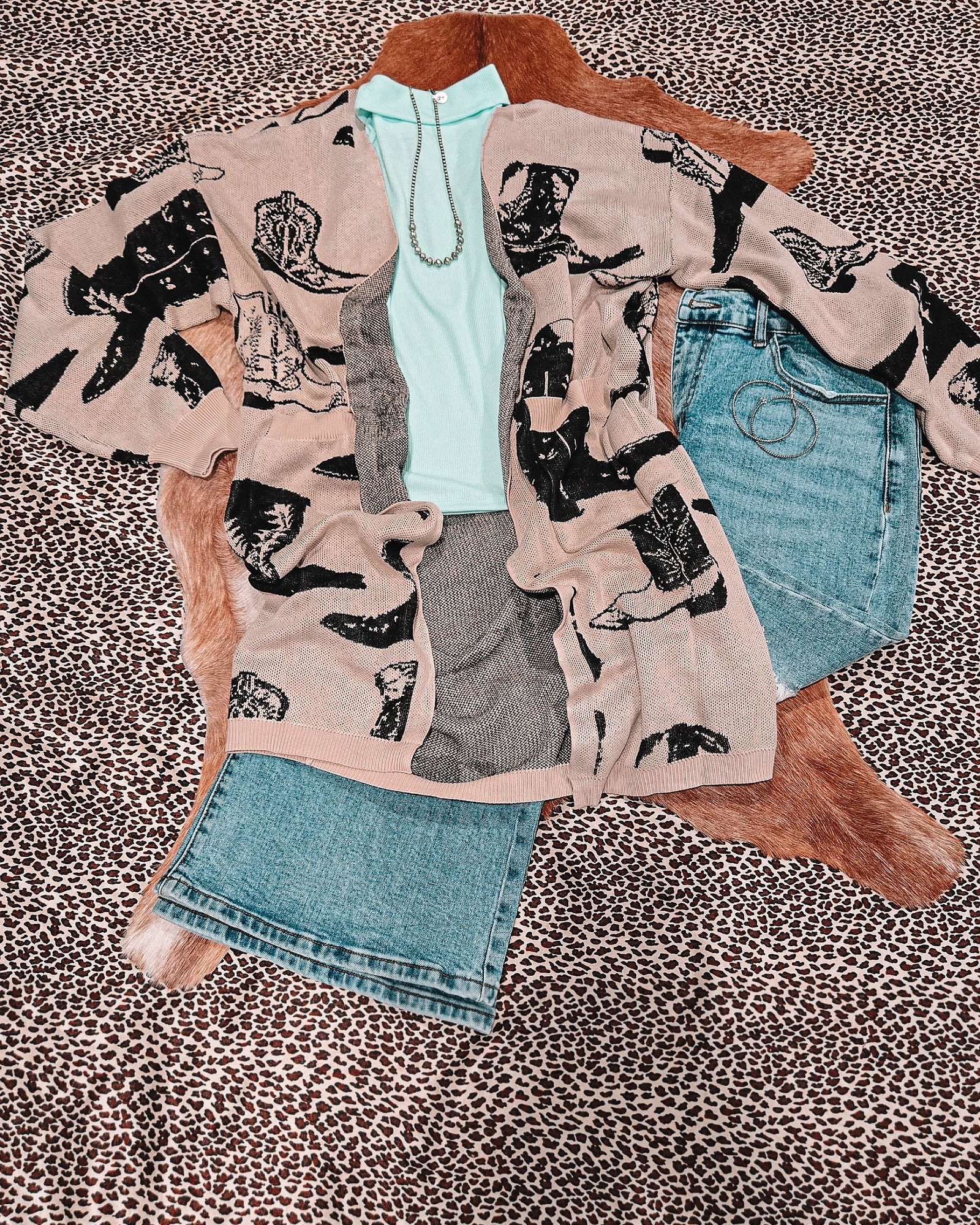Get ready to boot up your fashion game with the Boots A Million Cardigan! Featuring a unique boot pattern and soft, flowy material, this cardigan is not just stylish, but also the comfiest one you'll ever wear. So go ahead, strut your stuff and stand out from the crowd! (Seriously, it's the boot cardigan of your dreams!)
