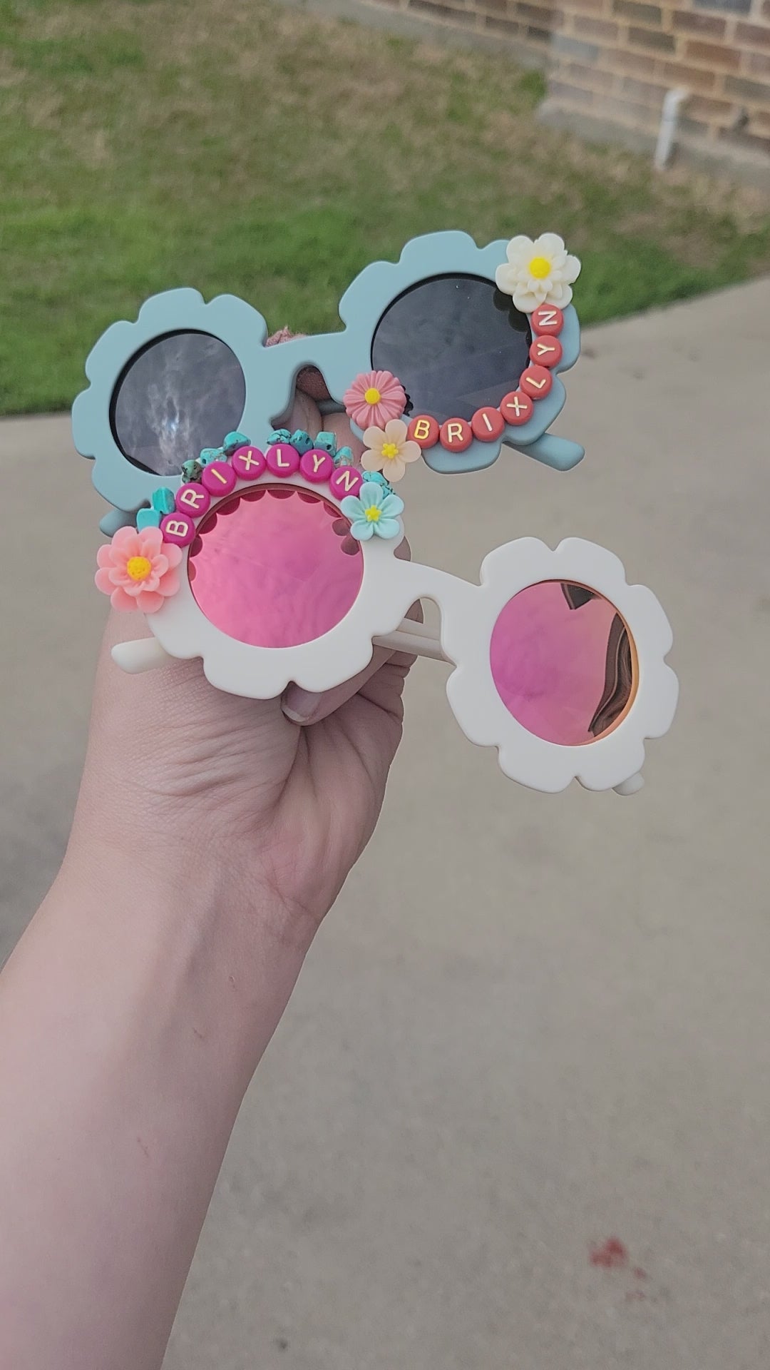 The cutest custom sunglasses to have your toddler rocking in style! For name, name colors and flower colors PLEASE PLEASE PLEASE email us for options after ordering, there is too many to list on here!