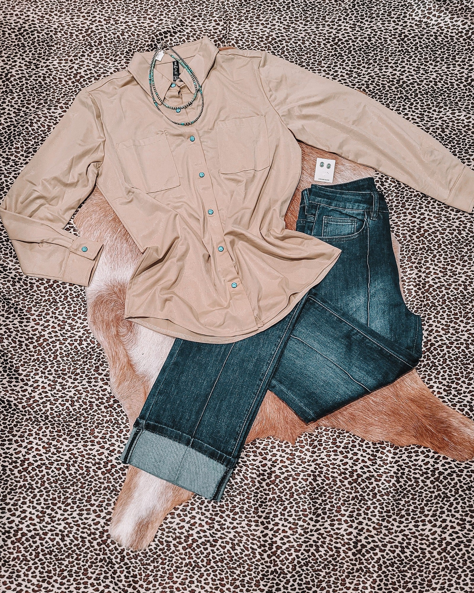 "Unleash your inner cowgirl with our Leather Lux Pearl Snap shirt in Sand. With a soft faux leather look and pearl snap buttons, it's perfect for any occasion. Plus, it offers great stretch and room for ultimate comfort. Yee-haw!"