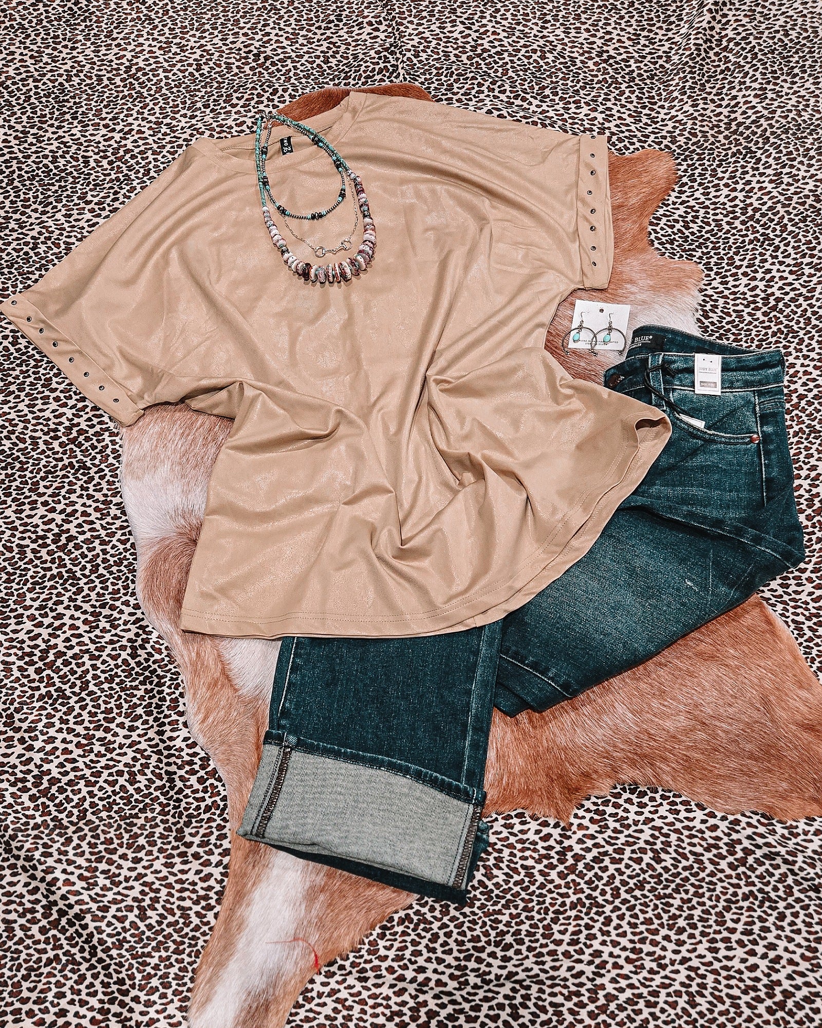 "Upgrade your style game with our Luxy Bucks Basic Oversized Top! Made with a leather-like material, but feels as soft as butter. The oversized fit adds a touch of comfort, while the concho stud sleeve details give off a unique and chic vibe."