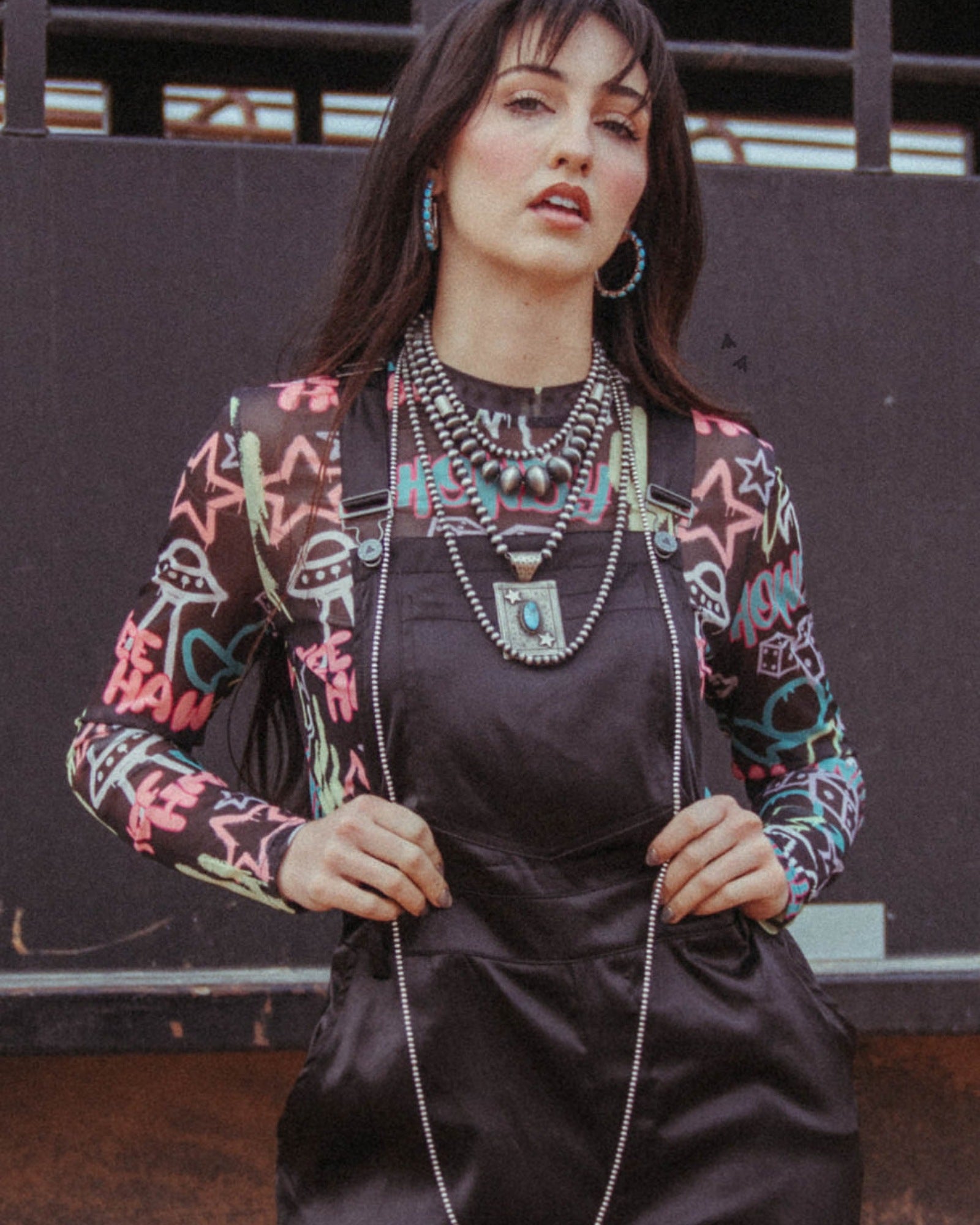 Satin overalls with a western touch?! They couldn't get any better than that. True to size with an elastic waist and adjustable straps.