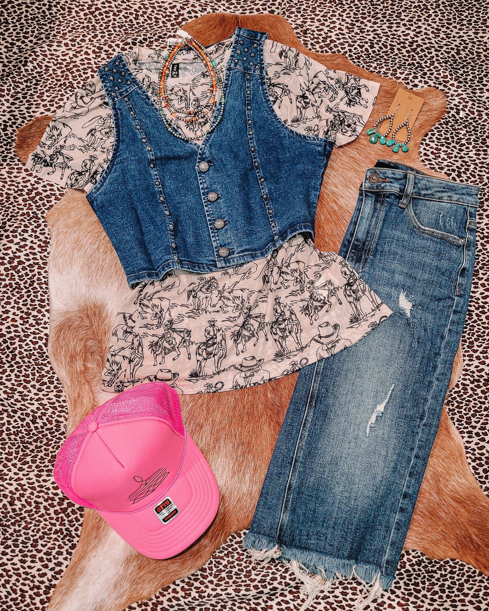 A denim vest to wear again and again! Some stretch and concho studs too!