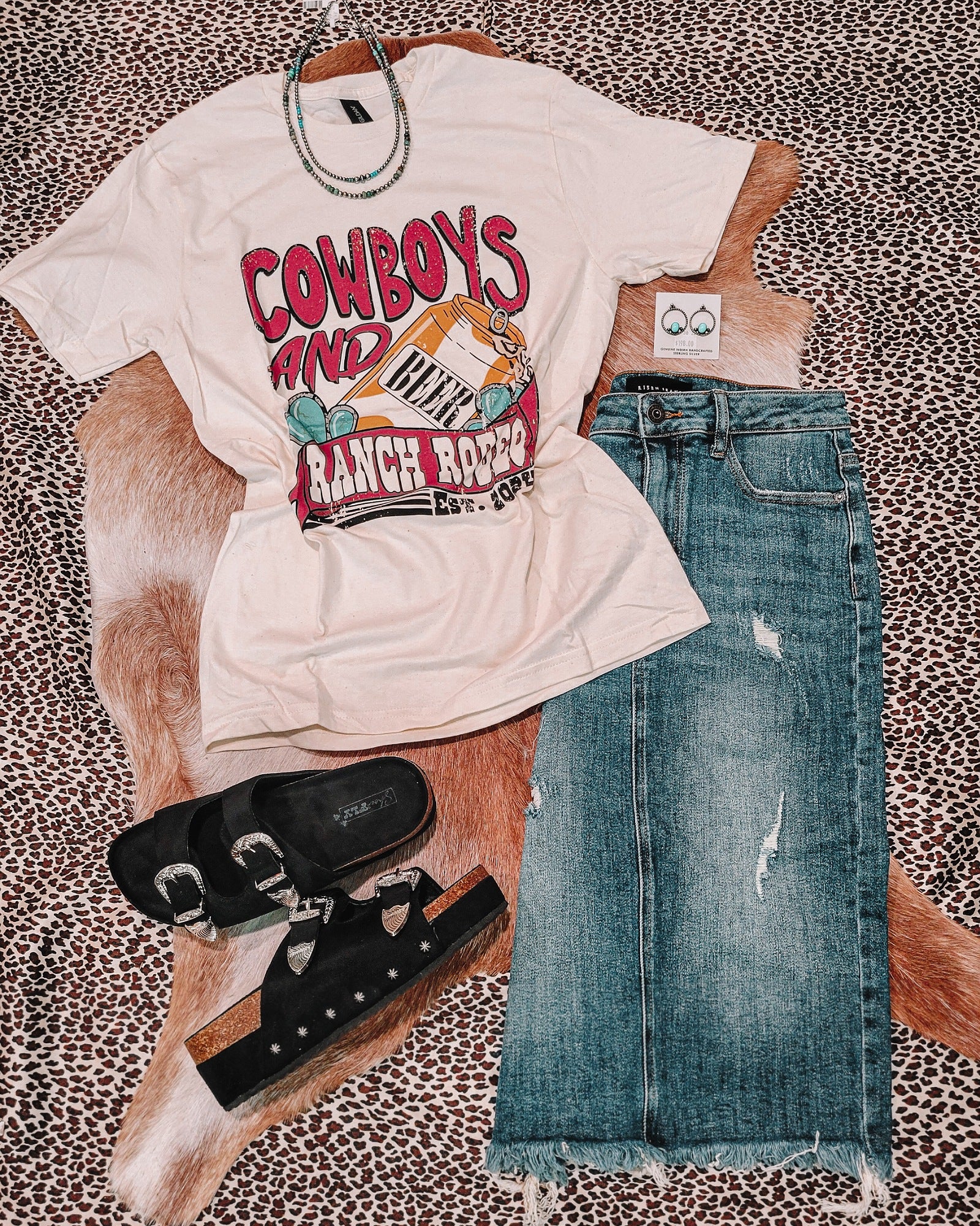 "Get ready to wrangle some fun with our Ranch Rodeo Tee! This Gildan soft style tee is perfect for cowboys and beer lovers alike, combining two big loves for a rodeo time like no other. Saddle up and show off your playful side with this quirky and comfortable tee. Ride 'em cowboy!"