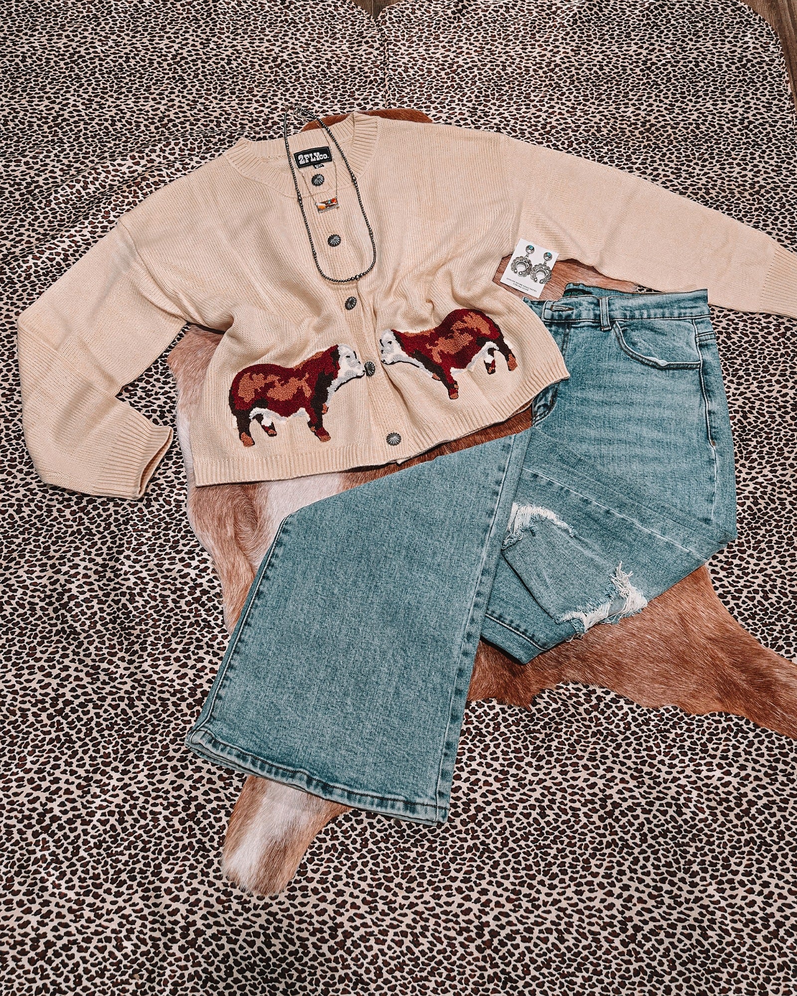 Step into cozy western charm with the Ranch Royalty Cardigan, a soft, sand-toned knit designed for the woman who carries cowgirl class in everything she does. This button-front cardigan features two beautifully stitched Hereford cattle motifs, adding a touch of ranch-raised elegance that turns a simple layer into a statement piece.