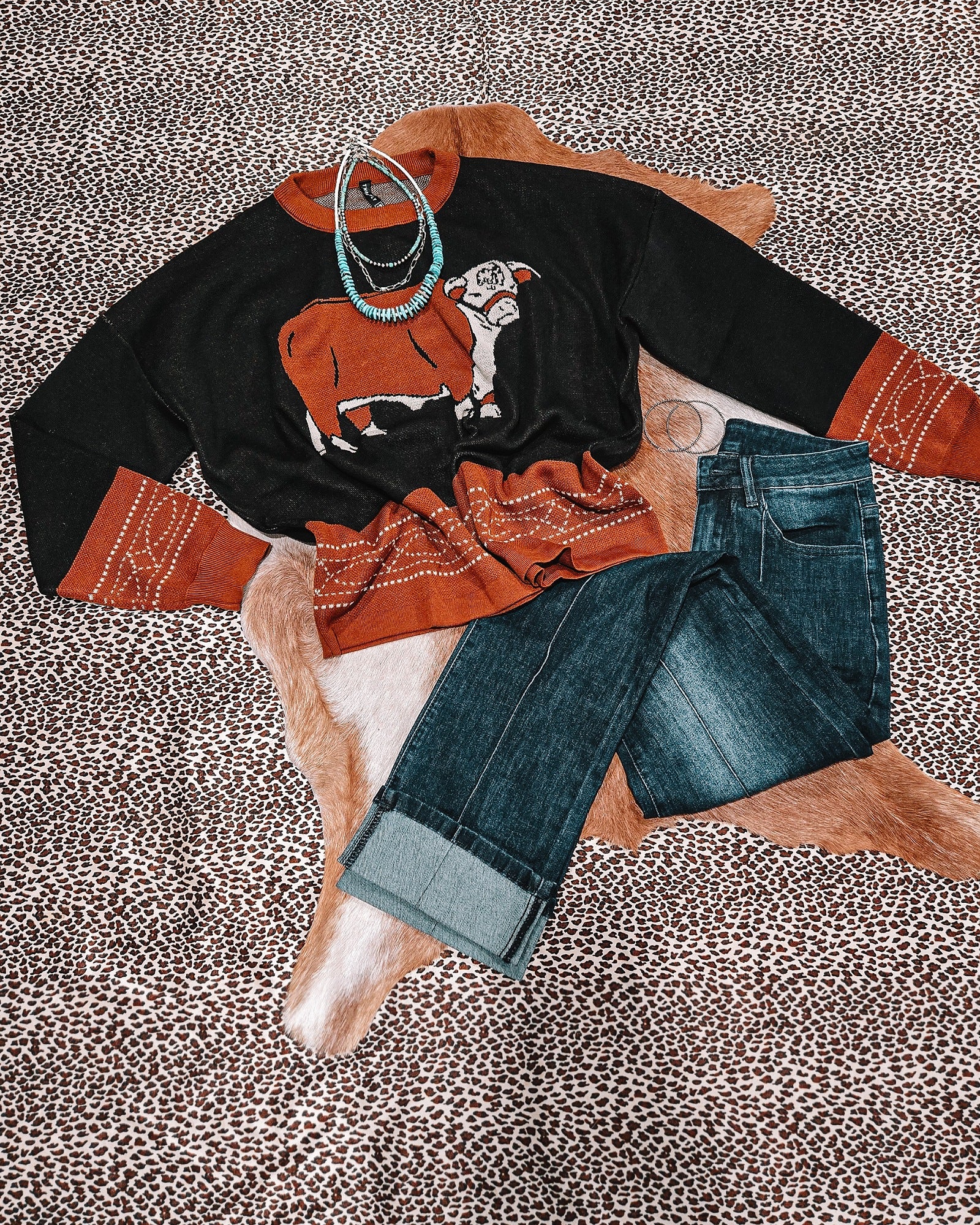 Unleash your inner rowdy spirit with the Rowdy Rojo Sweater. This oversized sweater features a Hereford design to add a touch of fun. With its soft material, you'll never want to take it off! Say goodbye to boring sweaters and hello to a playful and cozy option.