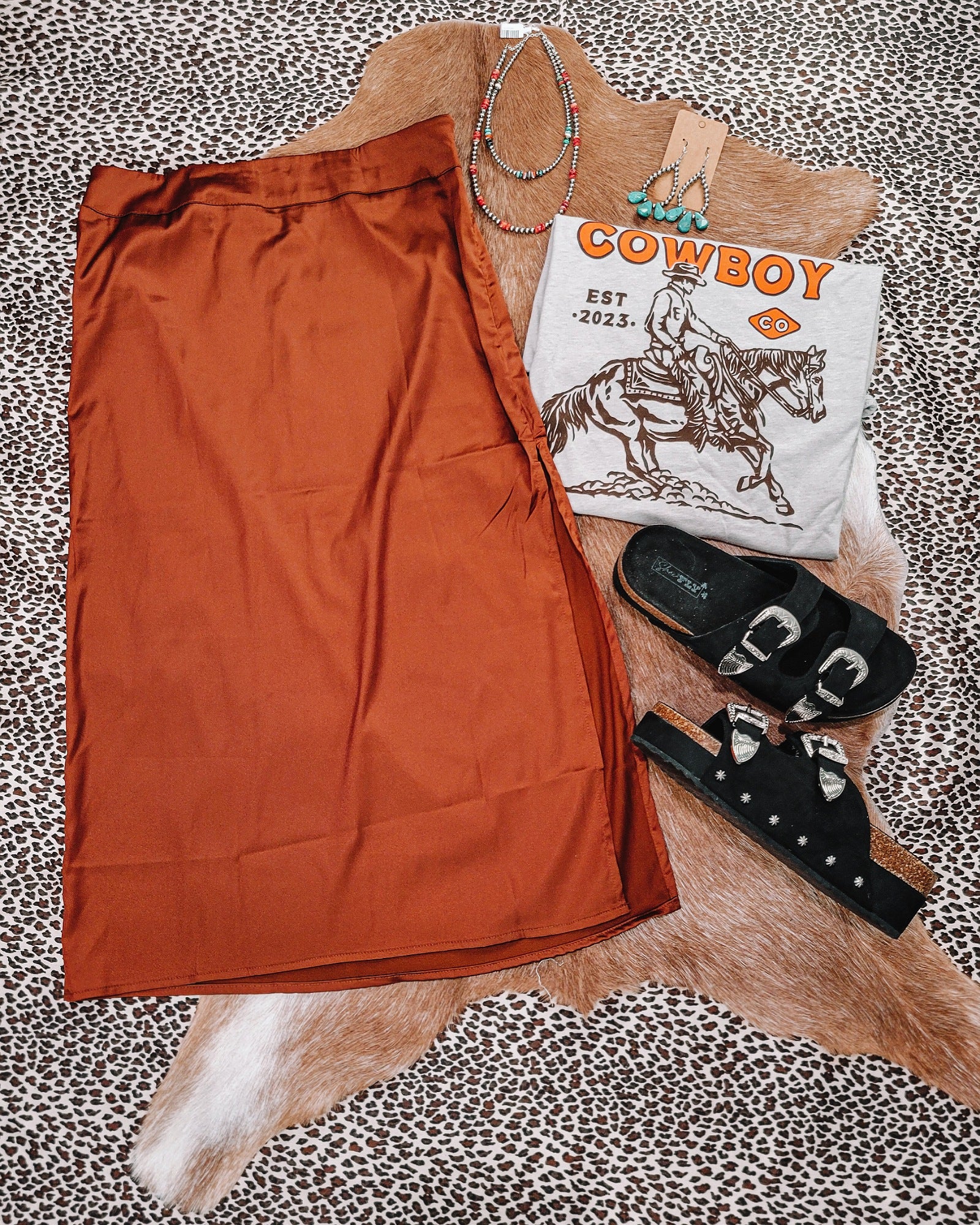 "Kick up your style with the Show Me That Gallop Skirt! This satin skirt features a high slit and a zipper on the side for easy wear. With its stretchy fabric, you'll feel comfortable and look effortlessly chic. Show off your playful side with this must-have skirt. (Satin + stretch = fashion win!)"