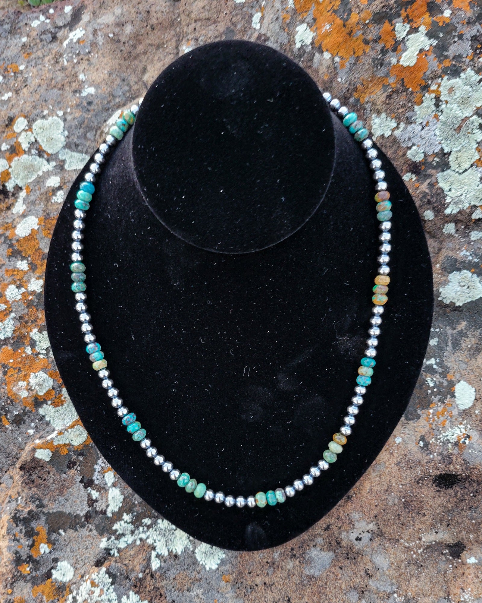 This 18" beauty is such a statement, yet simple too. 5 mm sterling silver pearls and turquoise with a lobster clasp