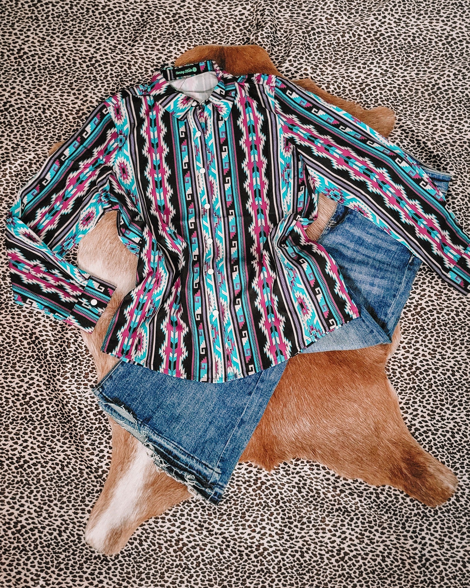 The Strait Pearl Snap: the perfect mix of retro and modern! Featuring a unique pearl snap design, this shirt is a must-have for any barrel race enthusiast. Add a touch of style and flair to your wardrobe with this one-of-a-kind piece.