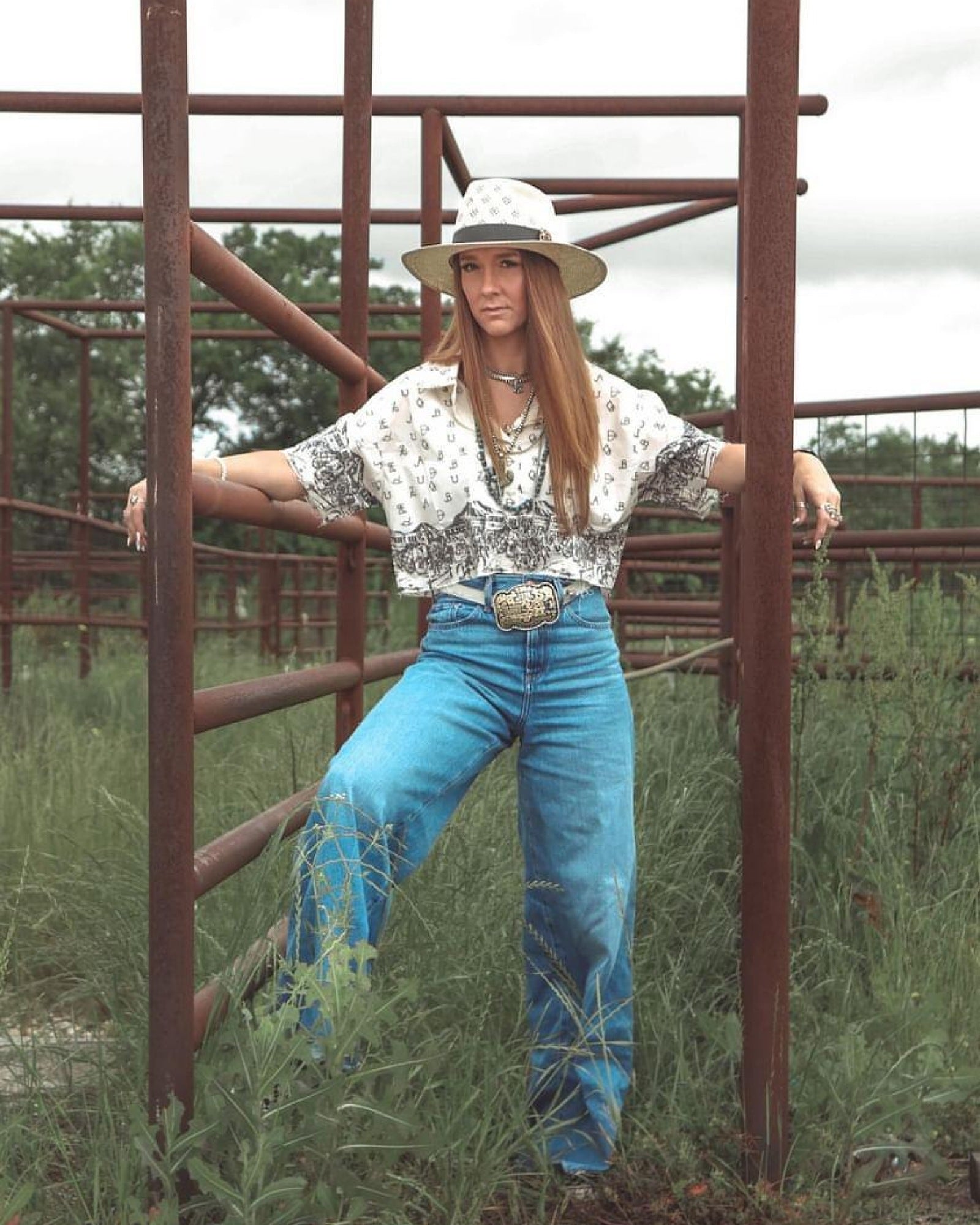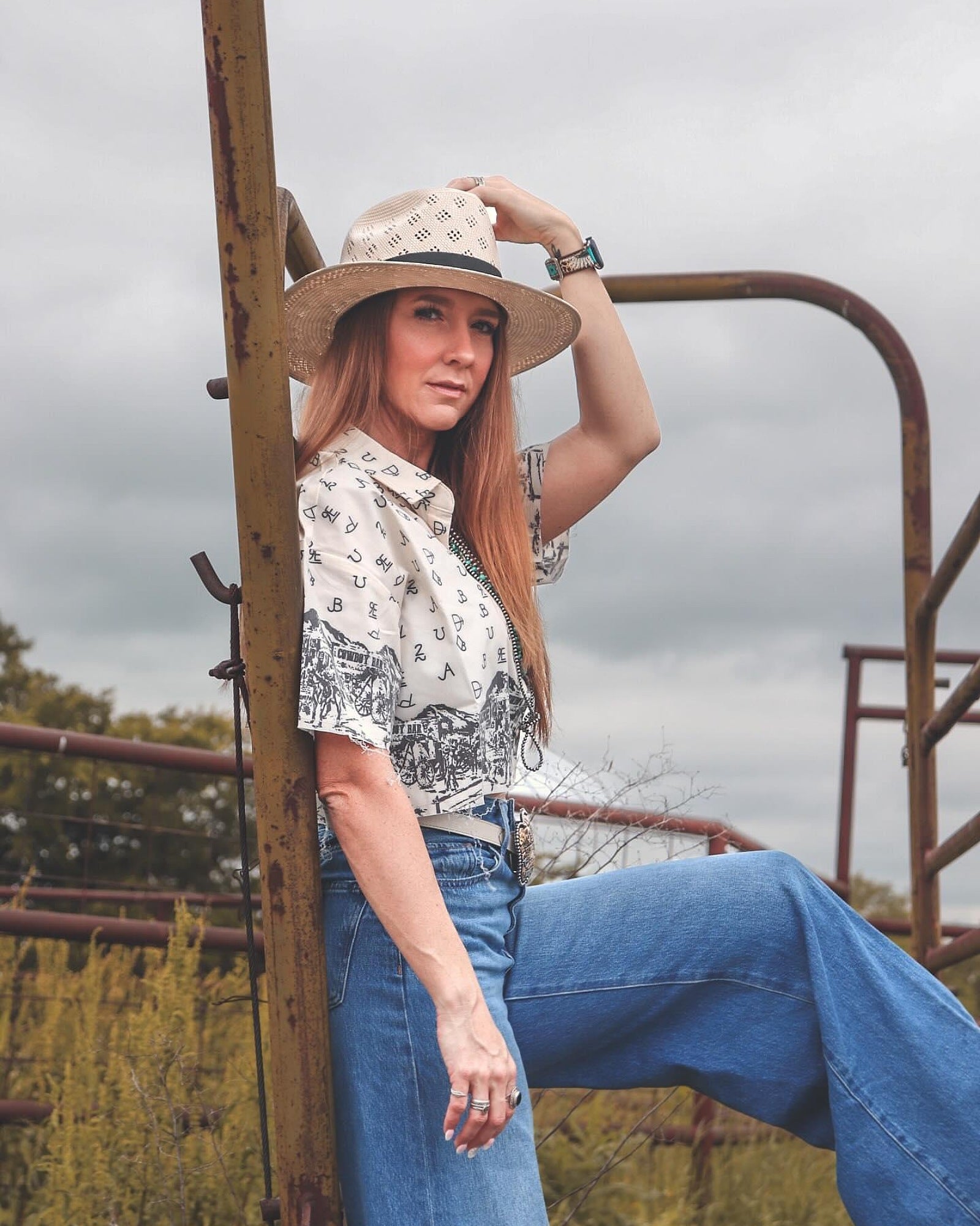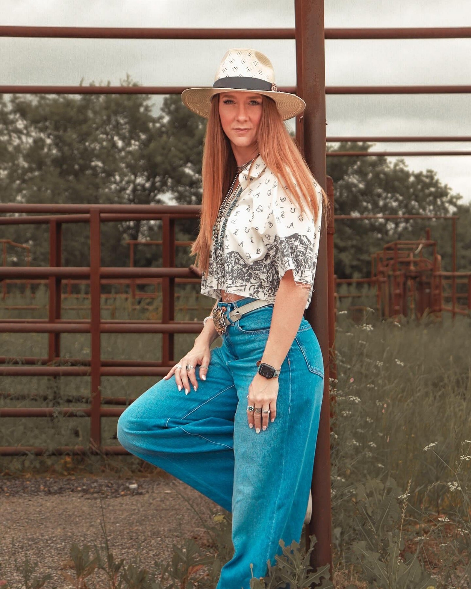 Get your country vibe on with the Tombstone Ghostown Cropped Pearl Snap. A nod to the Wild West with its cropped length and pearl snap buttons. Designed with a loose fit for comfort and unique cattle brand details for a touch of individuality. Giddy up!(Yeehaw!)