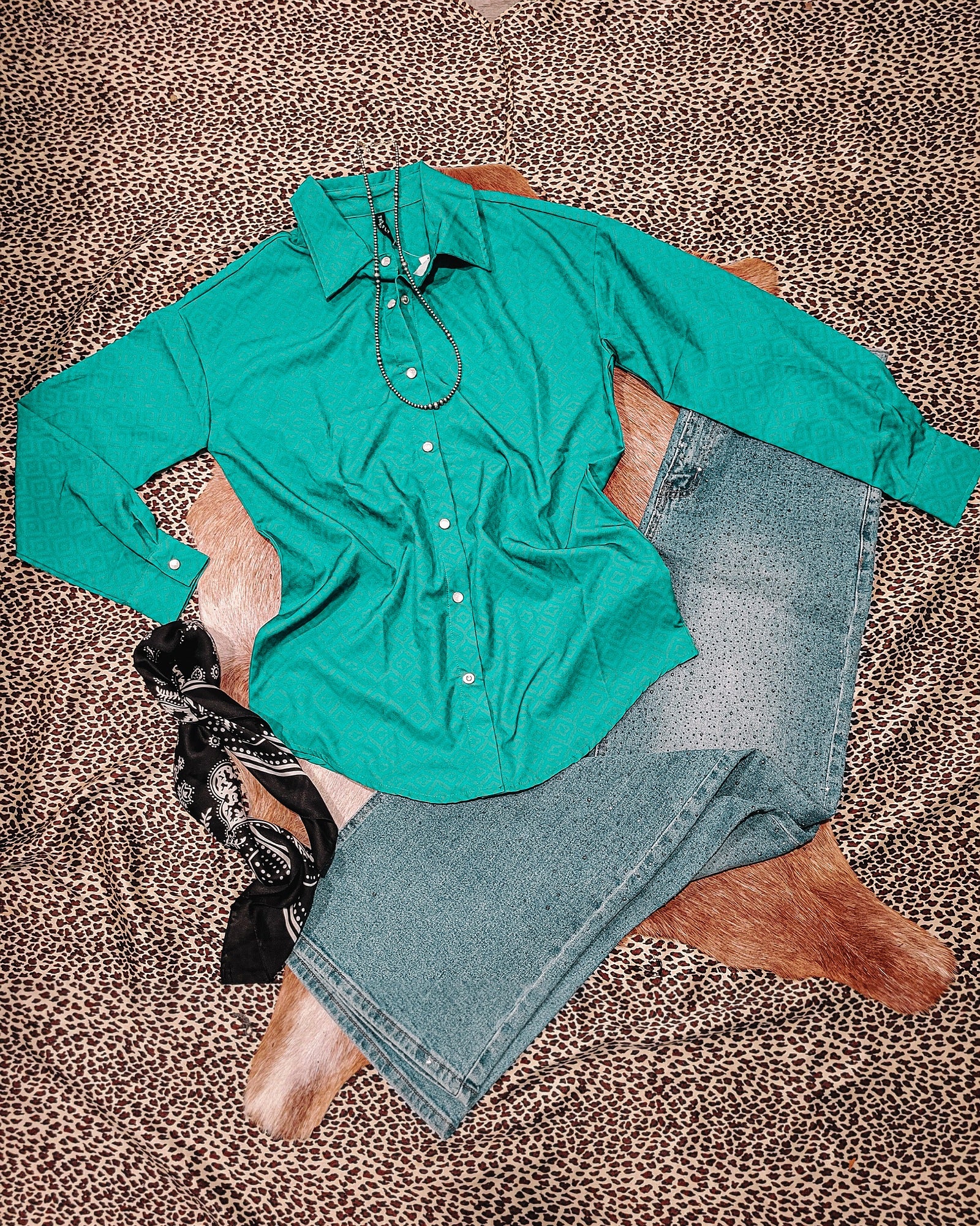 This pearl snap gives serious spring vibes! Great stretch and fun pattern too