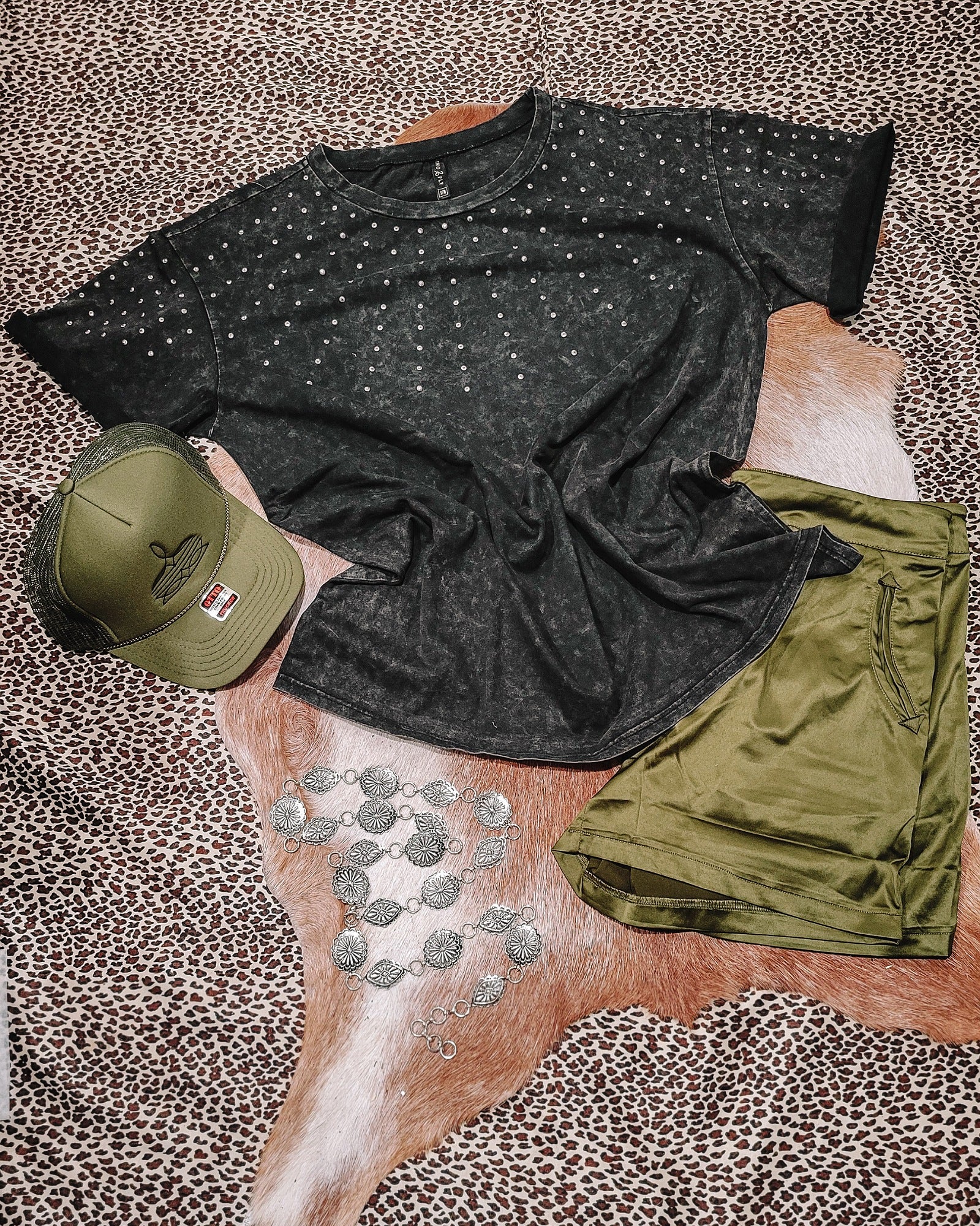 This oversized top is perfect for cute and comfy! Plus the studs are actually mini conchos!