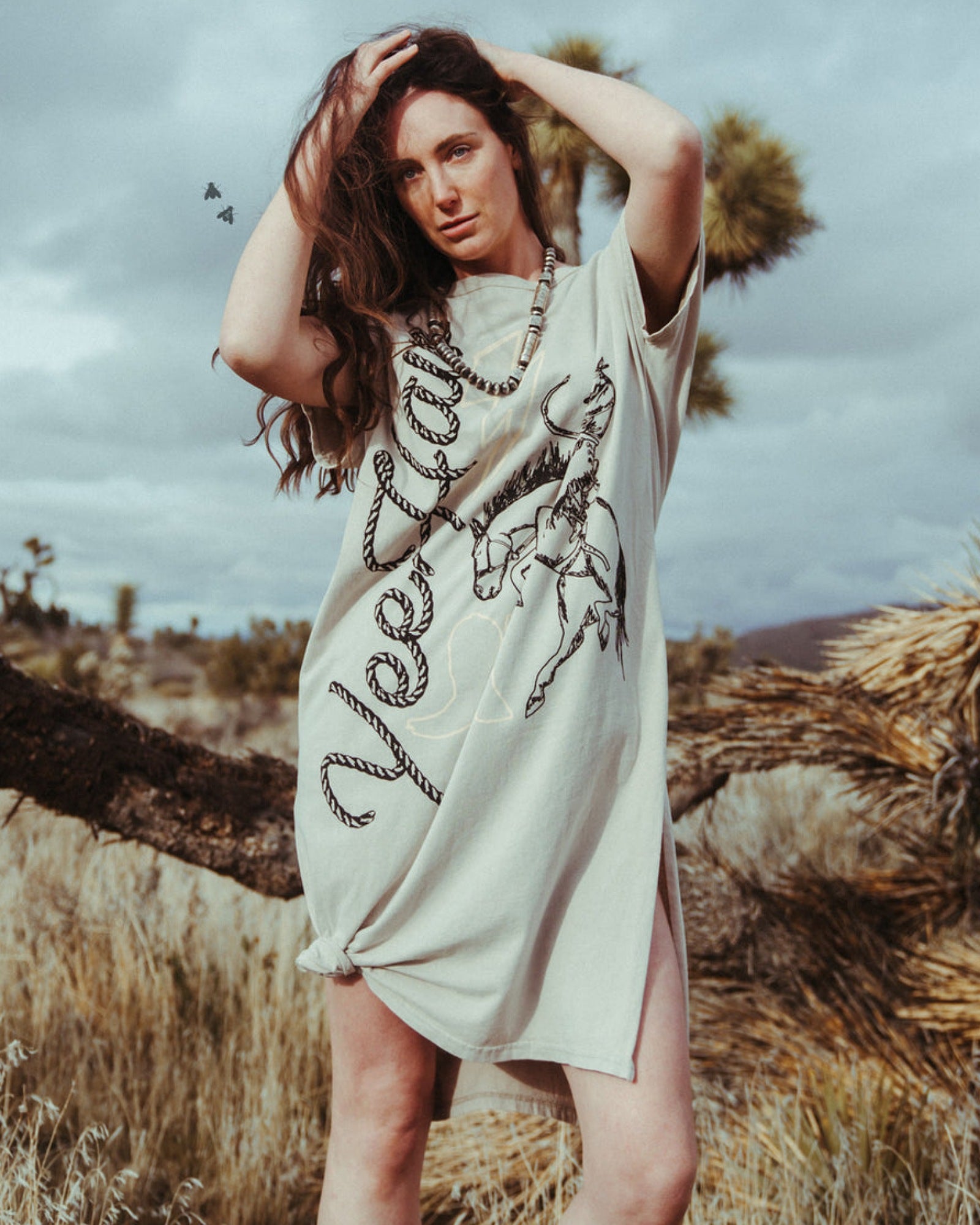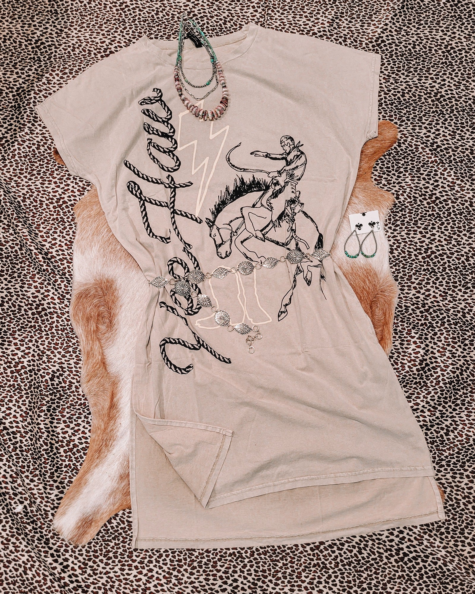 This t-shirt dress is mid length PLUS rocks a double slit on each side! Knot it up or wear it down and have some fun! Super oversized fit